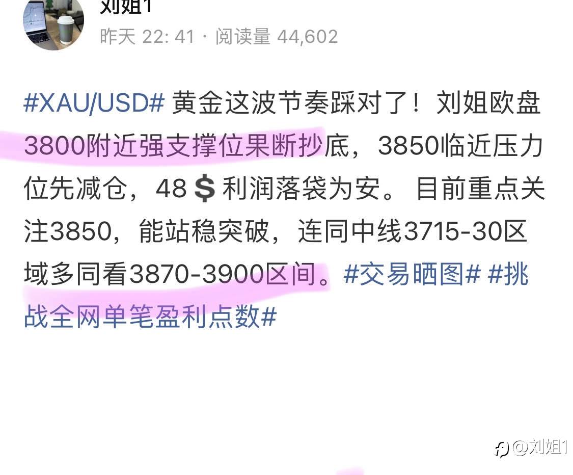 #XAU/USD# 刘姐3800+3833双点位多单布局,目标3863/72已收米入袋30+71 $