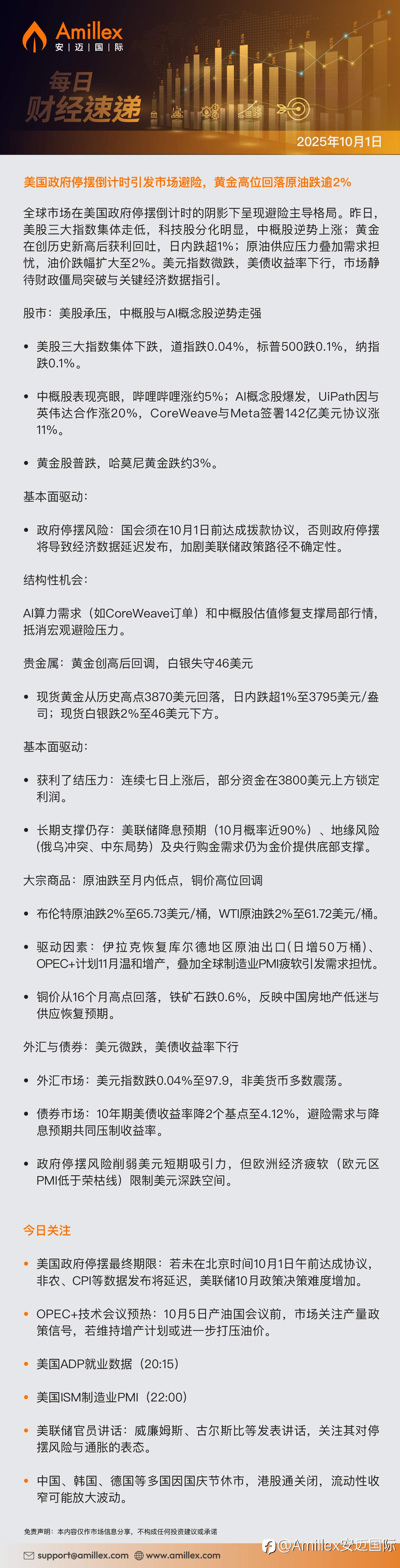 Amillex每日汇评:美国政府停摆倒计时引发市场避险,黄金高位回落原油跌逾2%