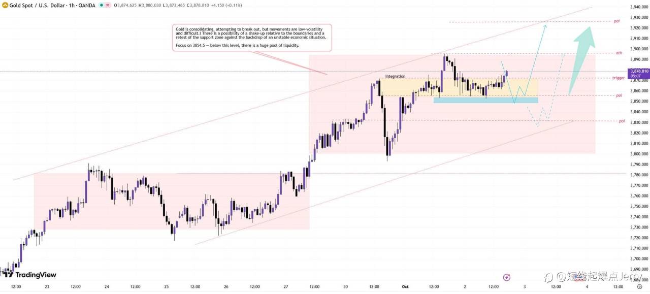 现在最有可能的情况是在 3854.5 支撑上方流动性区域出现多头挤压,随后继续大概率上涨至 3900位置 上方。