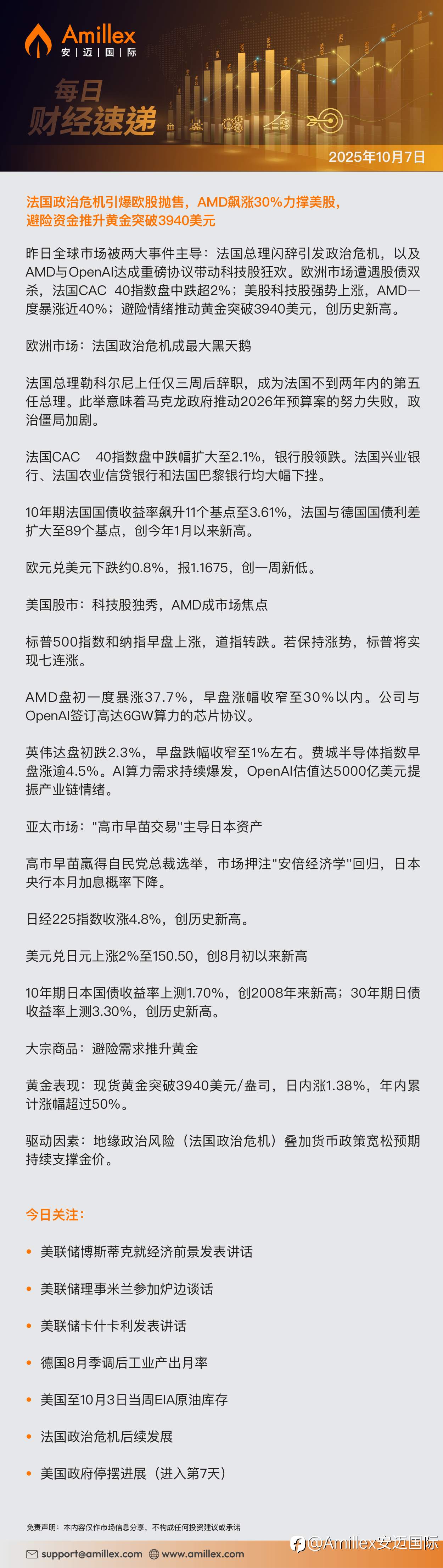 Amillex每日汇评:法国政治危机引爆欧股抛售,AMD飙涨30%力撑美股,避险资金推升黄金突破3940美元