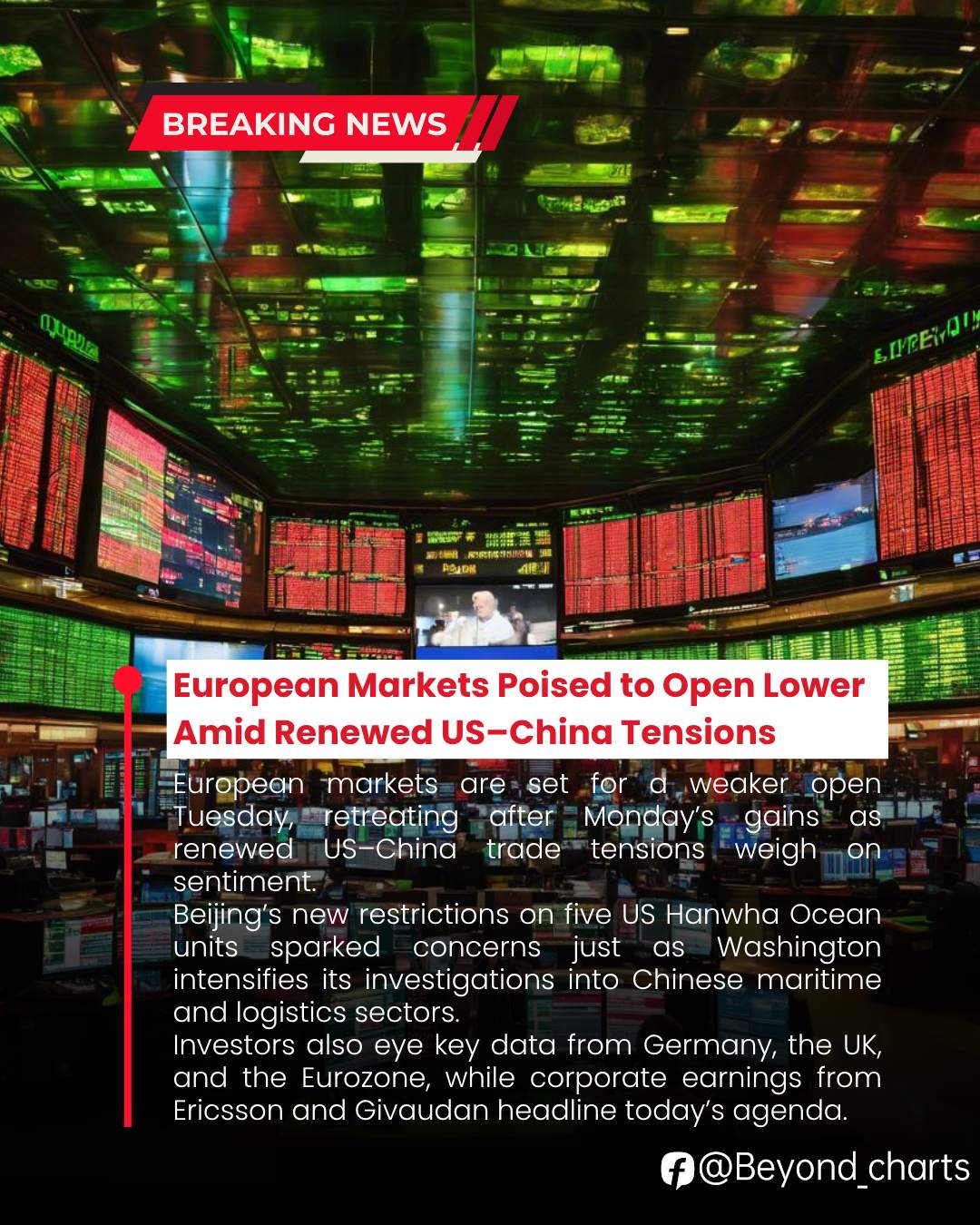 European equities are positioned to open lower as renewed US–China trade tensions dampen risk sentiment. China’s restrictions on five US Hanwha Ocean units come amid heightened scrutiny by Washington over Chinese maritime and logistics industries — unsettling global investors just ahead of the Trump–Xi meeting expected later this month.