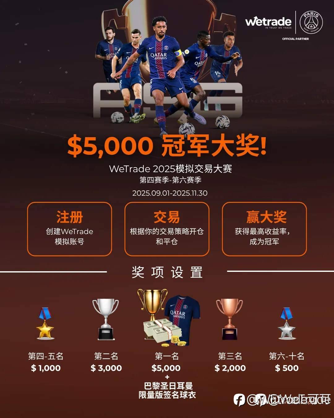 🚀WeTrade 2025模拟交易大赛 · 第六赛季震撼开启🏆 冠军独享 $5,000 现金大奖 ➕ 巴黎圣日耳曼限量版签名球衣🎯 零门槛参赛,人人可挑战 💸 奖金支持直接提现,真实回馈