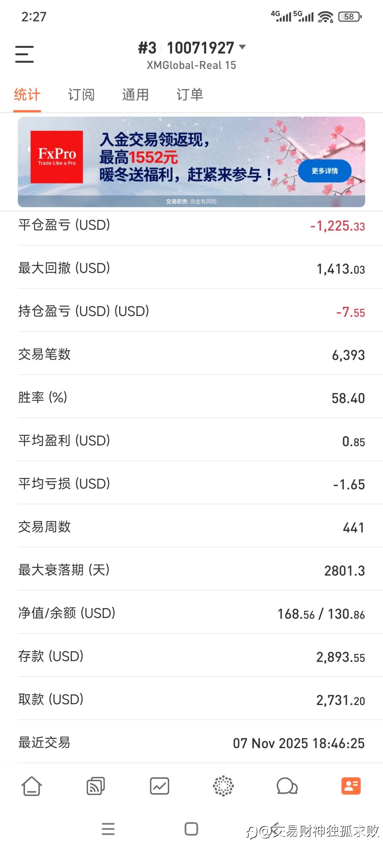 10071927帐户介绍,此帐户共交易了441周,相当于8年半!交易了6393笔,交易频次是比较低的!这也是我初入汇市的学习帐户,可以看到共计亏损1300刀不到!这也是我入了汇市后所交的全部学费了!再多最多就多两三百美元而已!并没有像很多人那样明明技术不行,拼命地入金死赌!结果帐户死了一大批!挂了无数帐户到FM都是亏损的!我也没有像有些人那样,爆了一个户,就认为是这个户的号码不吉利,于是想换运气,又重新开个户!我只认为是技术的不到位才会导致亏损!