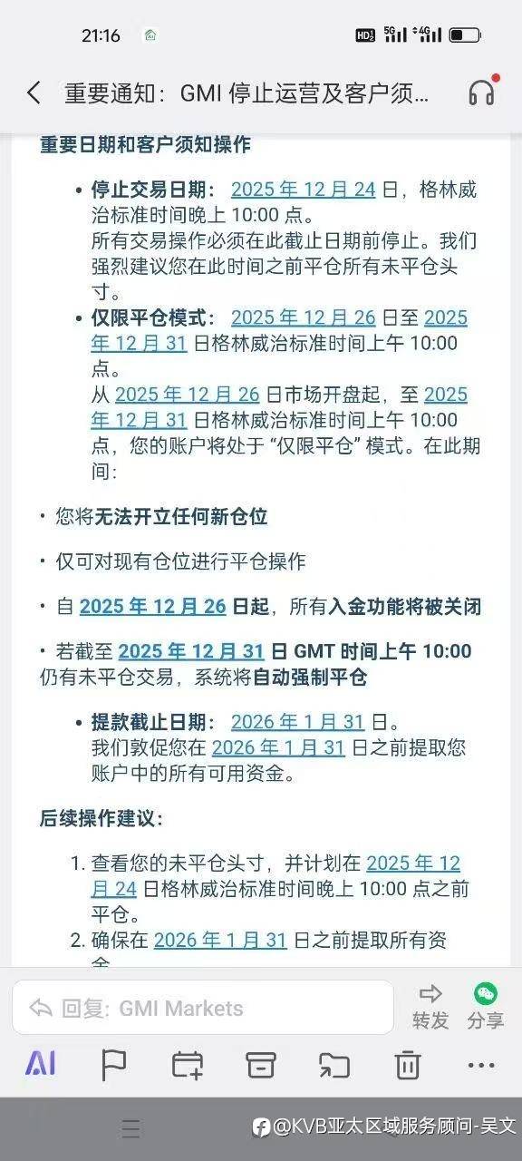 业内经营十几年的GMI平台,今突发声明关闭全球业务,在GMI的交易客户请联系你的客户经理核实情况,并按照平台指引出金等事宜;