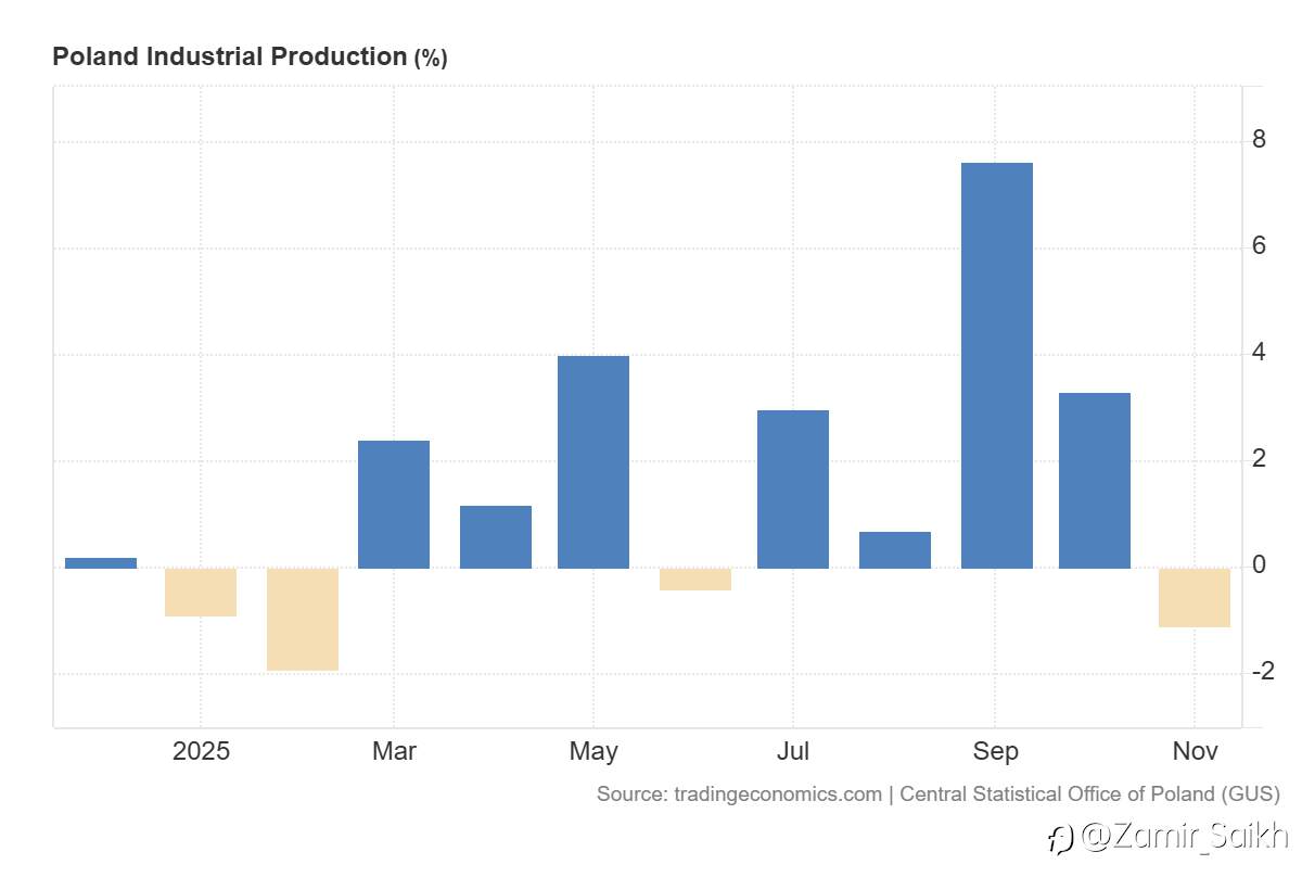 Poland’s industrial output fell 1.1% YoY in Nov 2025, missing expectations and marking the first contraction since June.