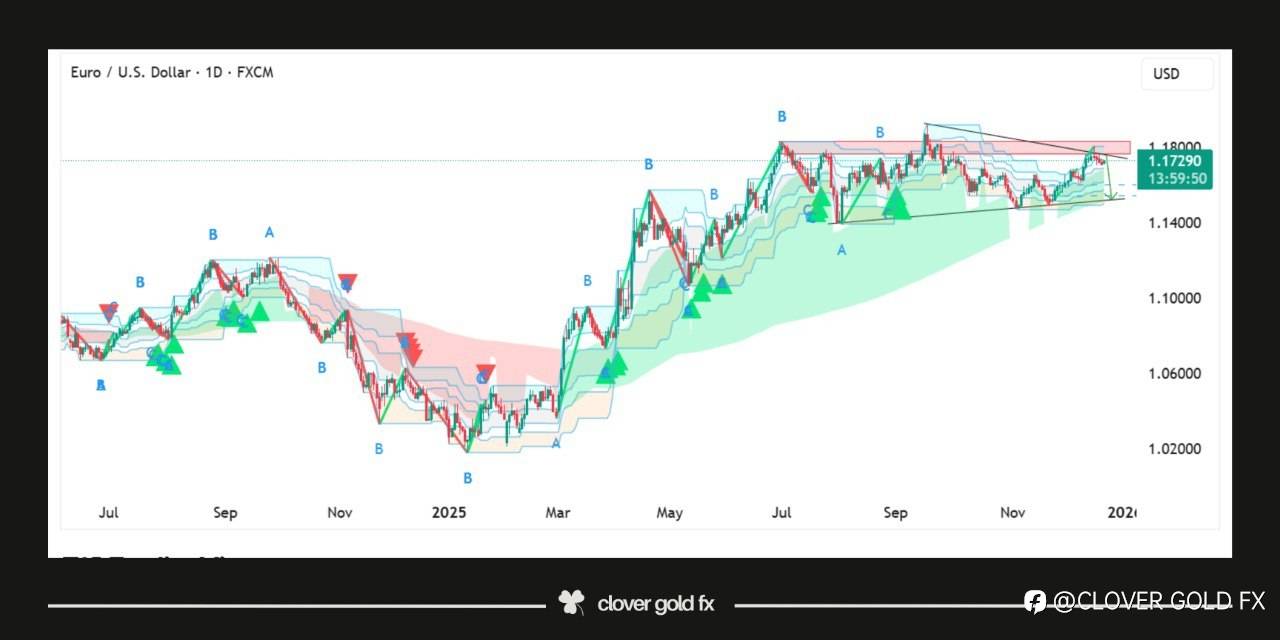 EURUSD shows a mature bullish structure that has transitioned into a contracting corrective phase. The prior impulse completed cleanly and price is now respecting a rising support trendline while repeatedly rejecting a major supply zone above. This behavior signals distribution rather than continuation as momentum weakens with each push higher. The sequence of lower highs against steady higher lows forms a classic wedge pattern which often precedes a decisive breakdown. The latest rejection from resistance followed by strong bearish pressure suggests sellers are gaining control. A move toward the lower boundary of the structure remains the higher probability scenario before any meaningful trend continuation can be considered.