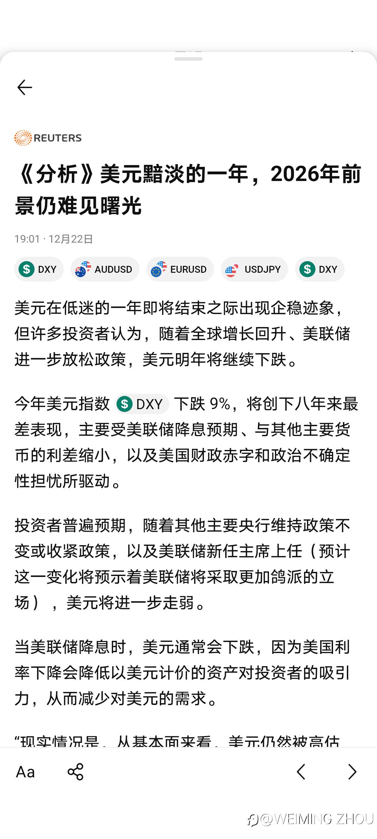 《分析》美元黯淡的一年,2026年前景仍难见曙光 REUTERS(路透社)