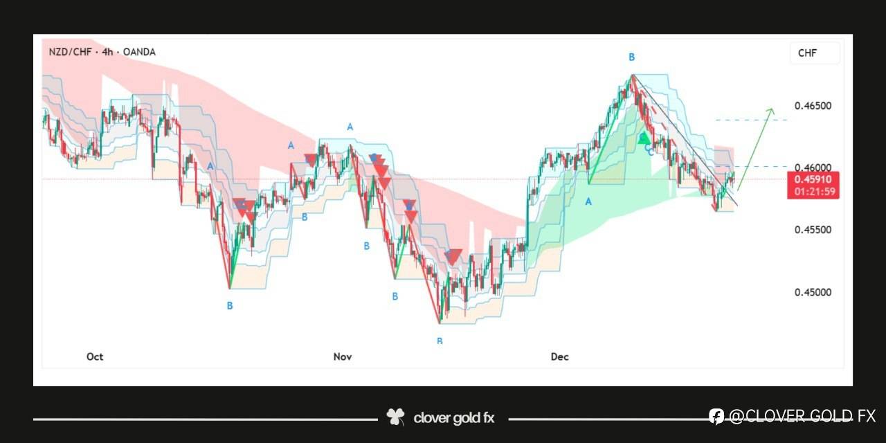 NZDCHF is showing a corrective structure after completing a strong impulsive advance where the market topped and entered a pullback phase that unfolded in a clear three wave correction this correction respected key retracement support and shows signs of exhaustion as selling pressure weakens near the lower boundary the rejection from this zone suggests buyers are starting to regain control and momentum is gradually shifting back to the upside the structure supports a potential continuation of the broader bullish trend as long as price holds above the recent corrective low a sustained recovery could lead to a move back toward the previous high area confirming trend strength and renewed bullish intent on the higher