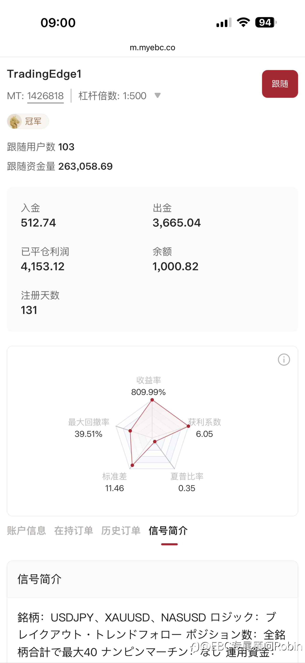 来自日本的职业交易员入驻EBC跟单社区4 个月,收益率710%