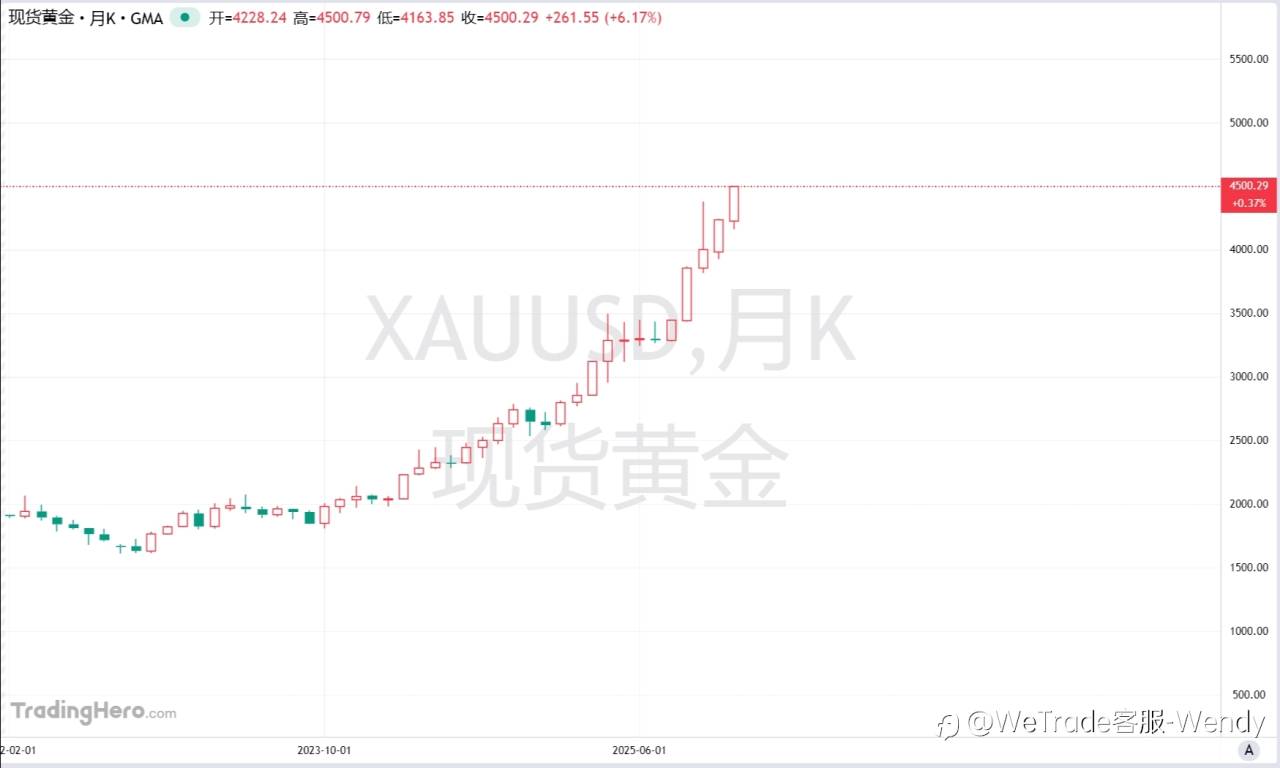 现货黄金首次涨破4500美元/盎司关口,今年累涨超1870美元。#FOLLOWME交易大赛##WeTrade众汇#