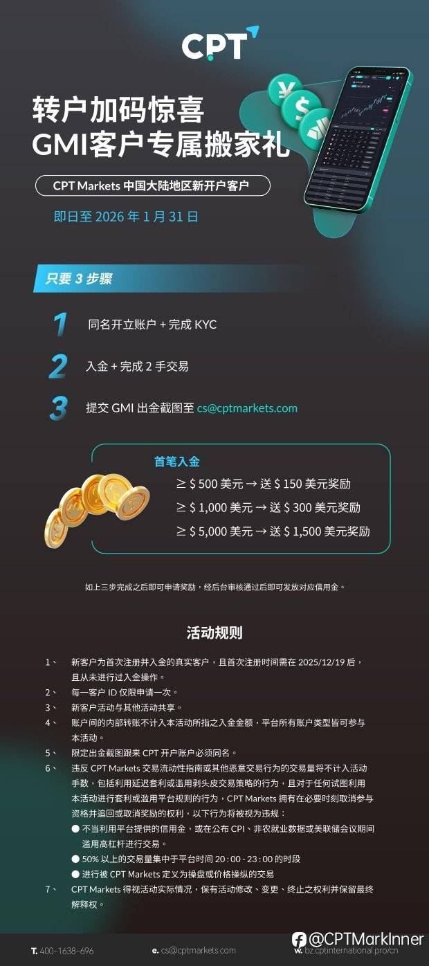 2025/12/19 后新开户客户,完成入金与2手交易,即可申请对应奖励。