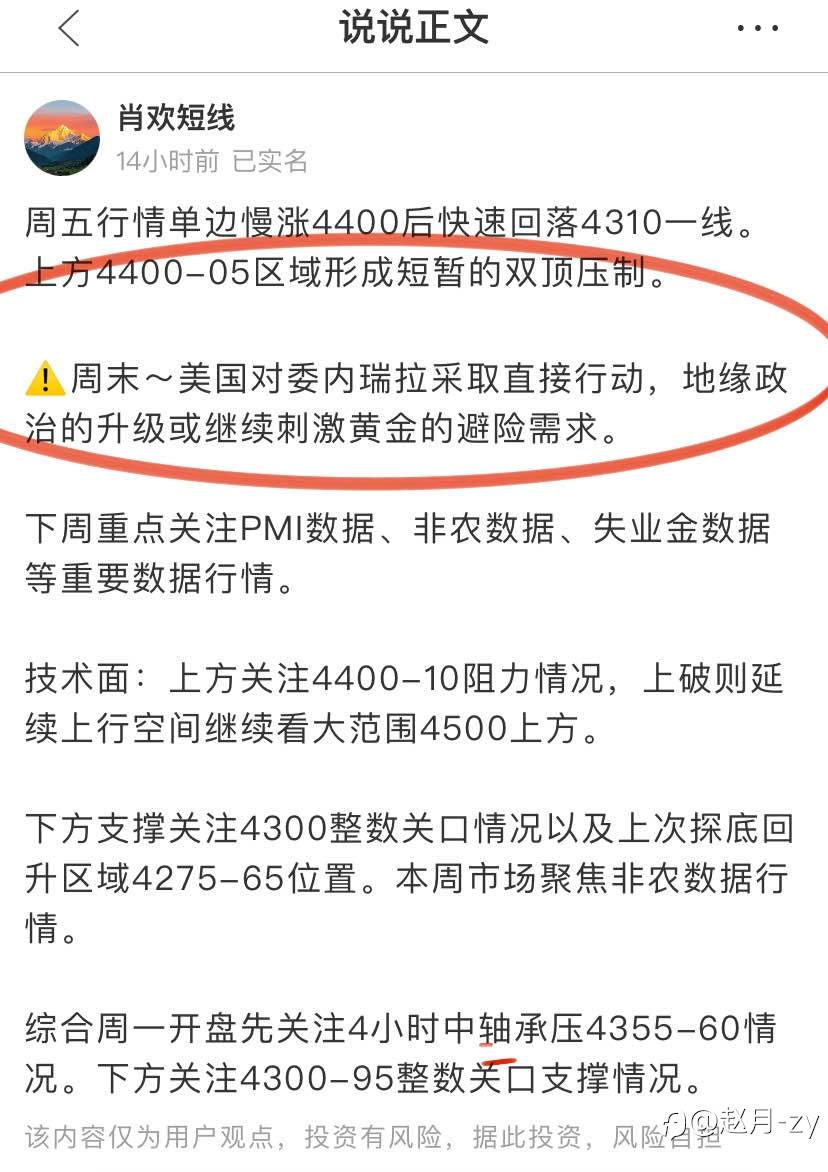 #XAU/USD# 周一黄金直接高开。避险情绪支撑金价,特朗普政府周六单方面对委内瑞拉发动军事袭击并抓获该国总统马杜罗的行动,加剧了地缘紧张。日内主要操作是回踩多为主,压力位短空为辅。