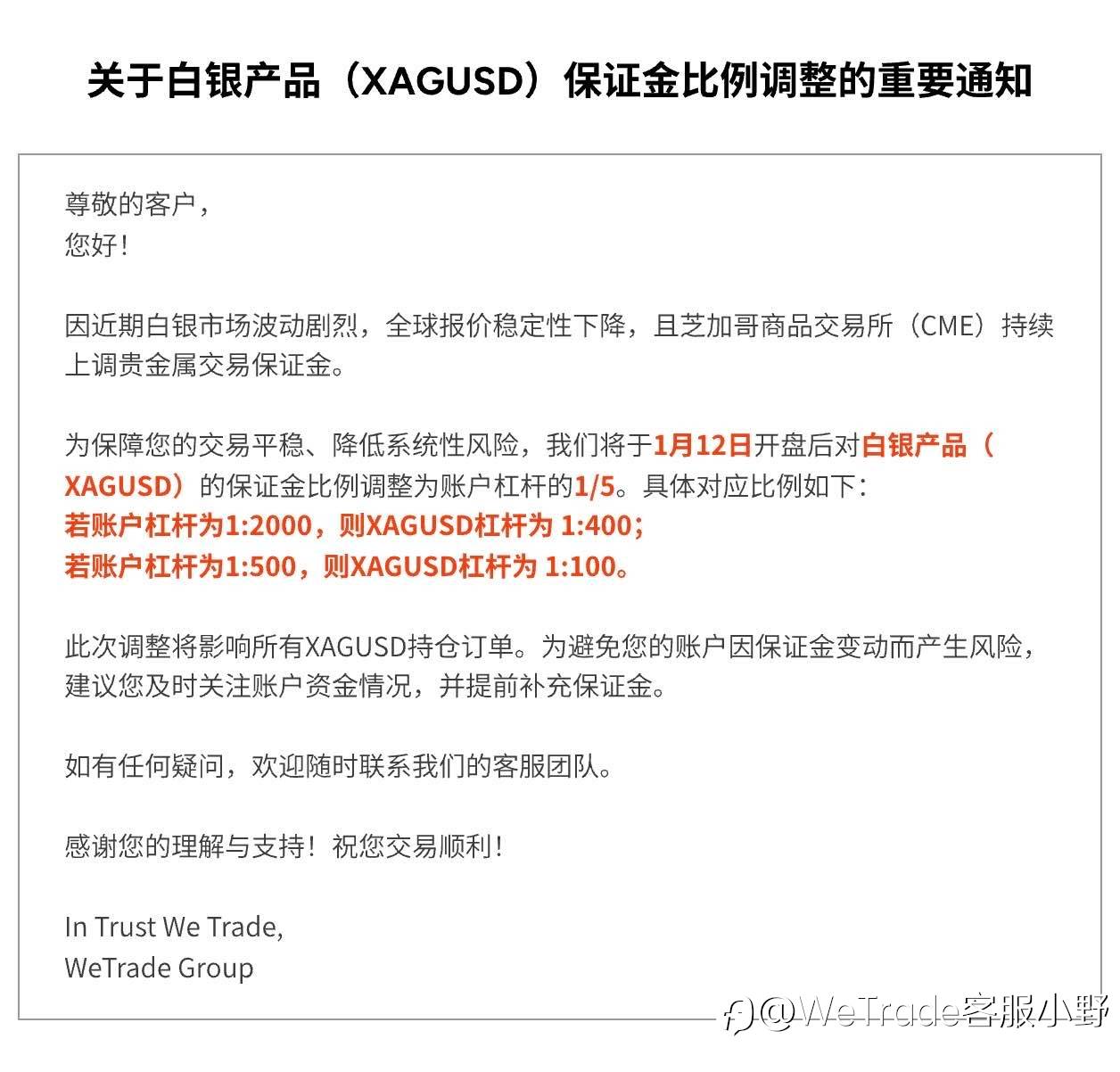 #WeTrade众汇# 关于白银产品(XAGUSD)保证金比例调整的重要通知
