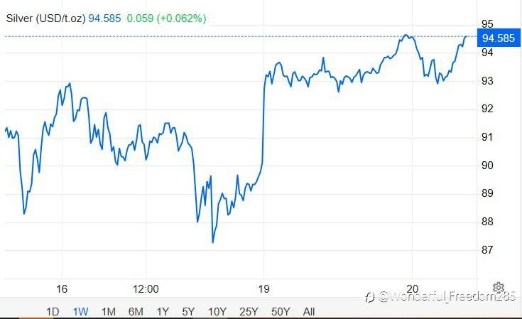 Silver dipped below $93.5 but remains near record highs.
