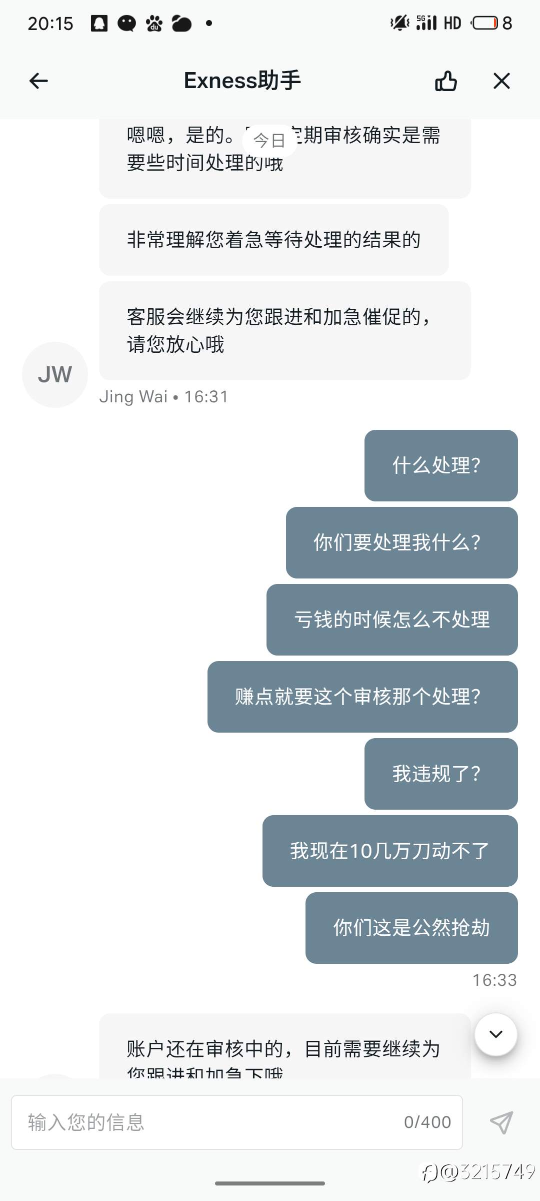 向大家揭露一下Ex的恶心行为,我现在账户里面10几万刀,都是赚的,平时交易没有什么手法和违规交易,就是梭哈。3天前在没有通知我的情况下,直接限制交易和禁止出金,去问客服告诉我是正常审核,每个客户都有,我的上级联系内部人员得知是直接风控,说我疑似违规交易。现在找谁都找不到,问就是在审核,并且告知我这个人的名字所开立的账户都不能再使用。