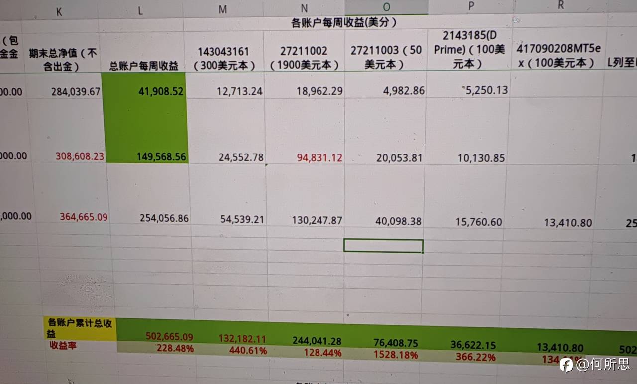 #每日交易打卡#收益比昨天手机算的要多些,看这周收益感觉这周有些激进,主要是exness前三账户收益额让人觉着上周持仓时肯定有风险暴露过大的时候。 下周就在总净值3600美金的基础上做。盈利在交易日先不转出了,等到周末再转出20%左右吧。下周50本账户0.04手起吧,尽量不手工单干涉;然后1900本账户降0.01到0.02仓位,留够本金以防50本账户需要救助;300本的就先暂时这样,或者降0.01手。两个净值100来美金的账户0.01手起,这两账户都已经翻倍了的,要不收益也暂时别取了,等到600后再取,这样这两账户就是很安全的了。