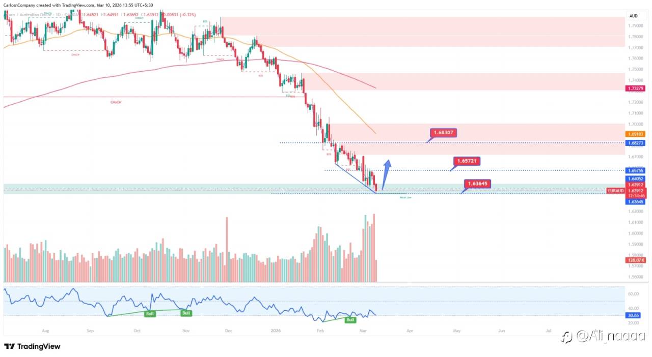 After a **prolonged selling pressure**, EUR/AUD has now reached a **major weekly demand zone near 1.6360**, where price is showing early signs of stabilization. The pair has been forming consistent lower lows, but the recent reaction from this demand area suggests that sellers may be losing momentum.
