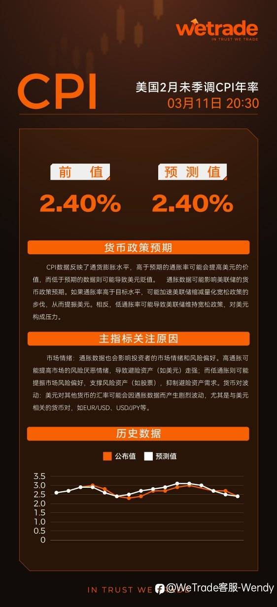 关注3月11日美国2月未季调CPI年率数据发布!