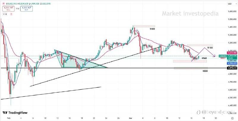 Prices briefly fell below $5,000 but rebounded as easing oil prices reduced inflation concerns linked to the conflict. The primary trend remains bullish; on the 4H chart, prices are moving within a range of 5150–4960.