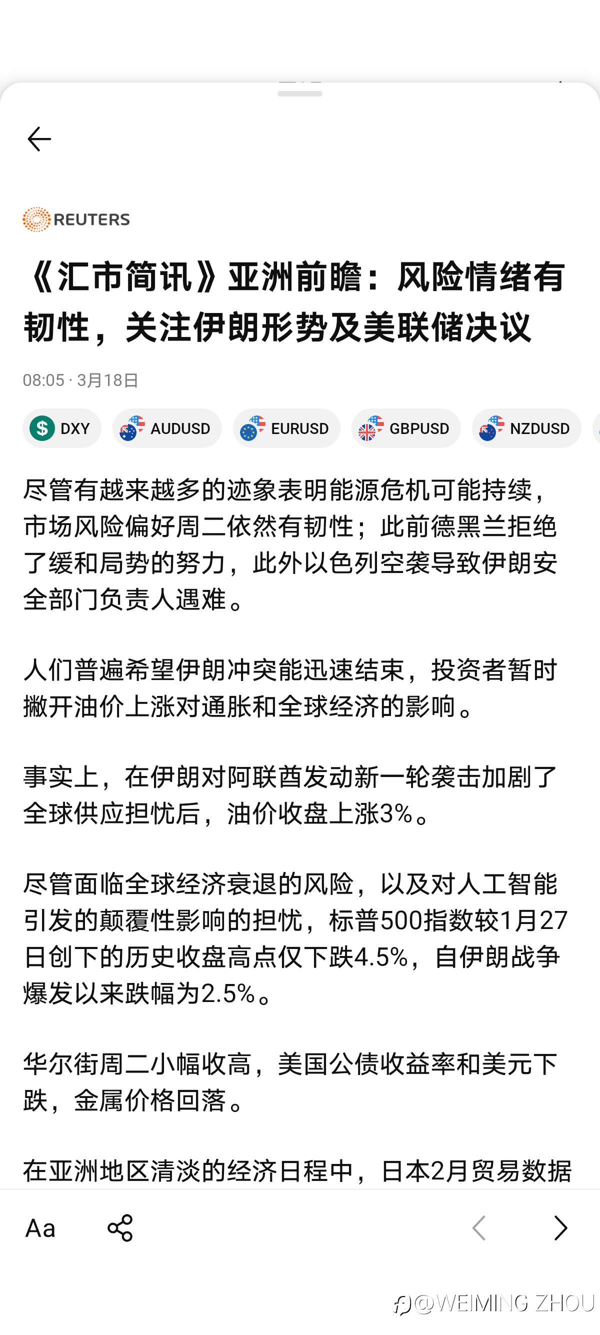 《汇市简讯》亚洲前瞻:风险情绪有韧性,关注伊朗形势及美联储决议