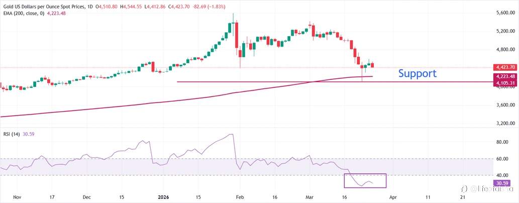 Gold price (XAU/USD) is falling 2% to close to $4,410 over the European trading session on Thursday. The precious metal is now under pressure following a sharp rebound in the past three trading days, where fears of continuing war in the Middle East have spread, after Iran rejected an offer of ceasefire by United States (US) President Donald Trump over a 15-point settlement plan and one month long ceasefire proposal.