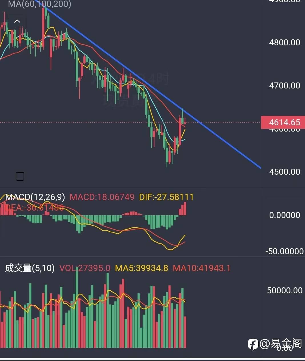 长周期指标DMI和TRIX快线均呈现弱势,表明短期内空方主导,今天月线收关,明天周线收关,下周非农周,5月的后半月会非常精彩!