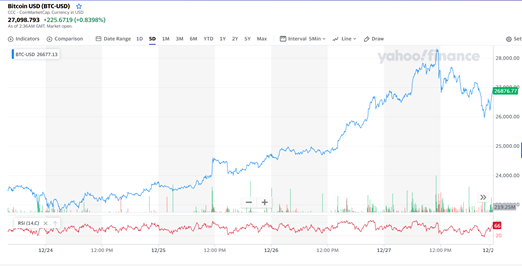 Source: Yahoo Finance The BTC/USD bulls seem unstoppable over the Christmas weekend as the price has surged past the $28,000 mark. The bulls made history when it broke past the $25,000 level earlier and with this new milestone achieved, the bulls seem to be unstoppable. Or are they? Analysts predict
