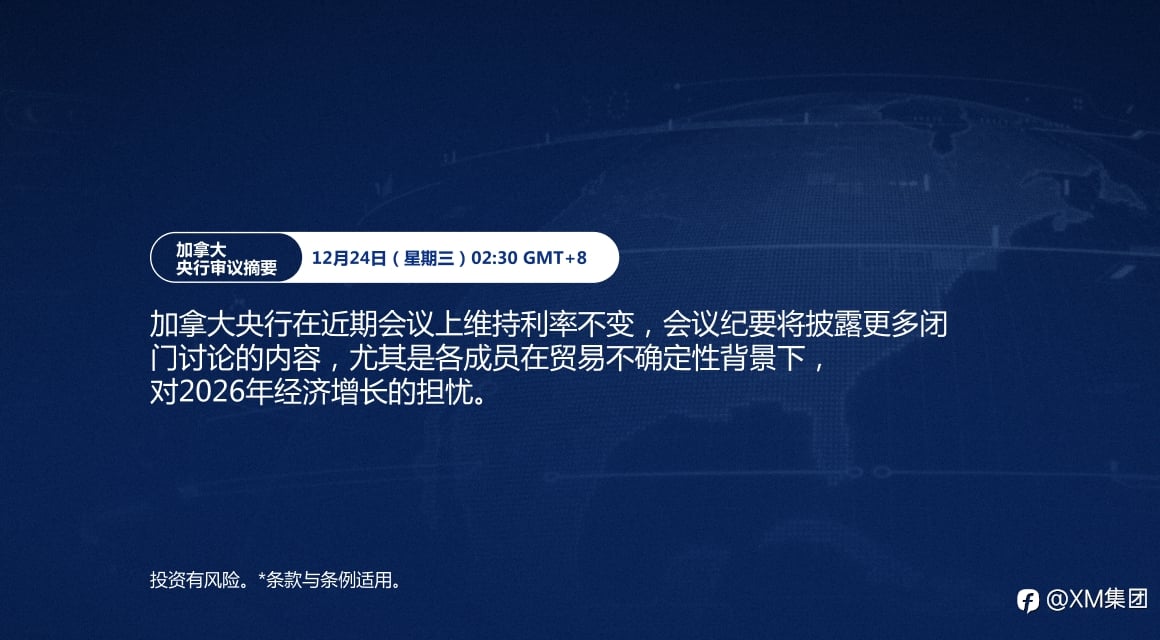 本周最值得关注的重大事件: 市场聚焦美国数据,包括ADP就业报告、ISM服务业PMI以及核心PCE物价指数,这些数据在美联储12月议息会议前受到密切关注。同时,欧元区CPI初值和加拿大就业数据也值得留意。 掌握市场动态。点击此处,查看完整经济日历: