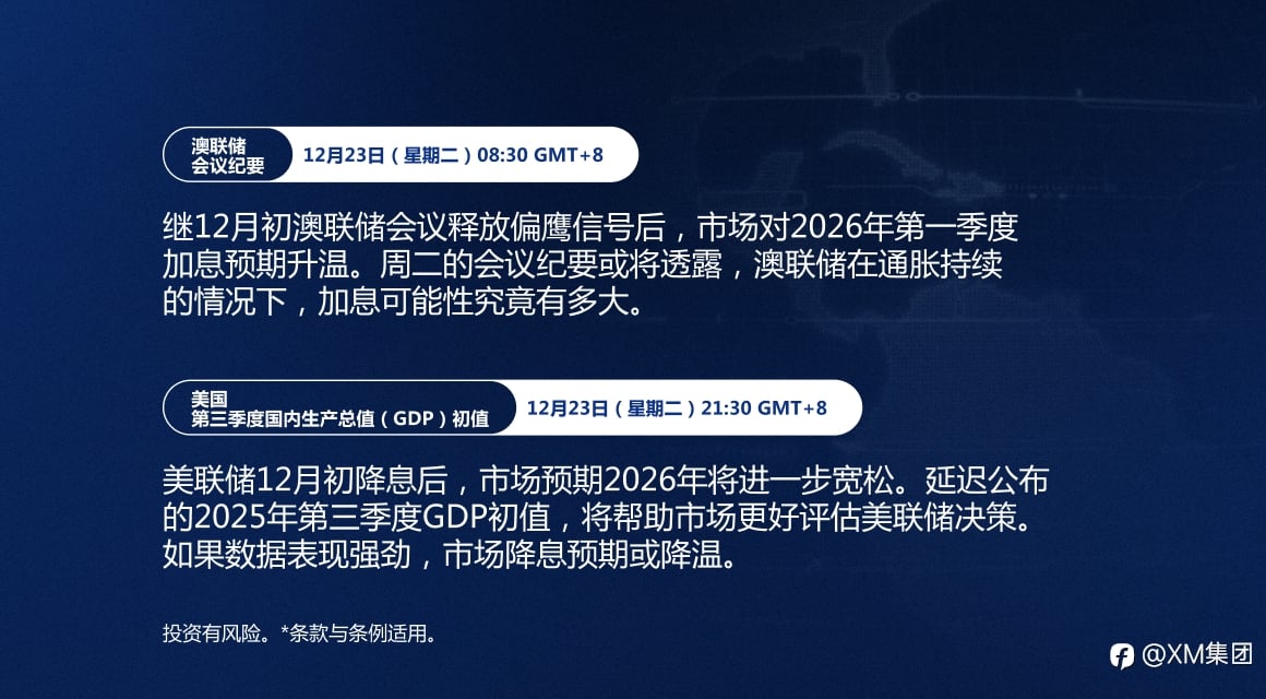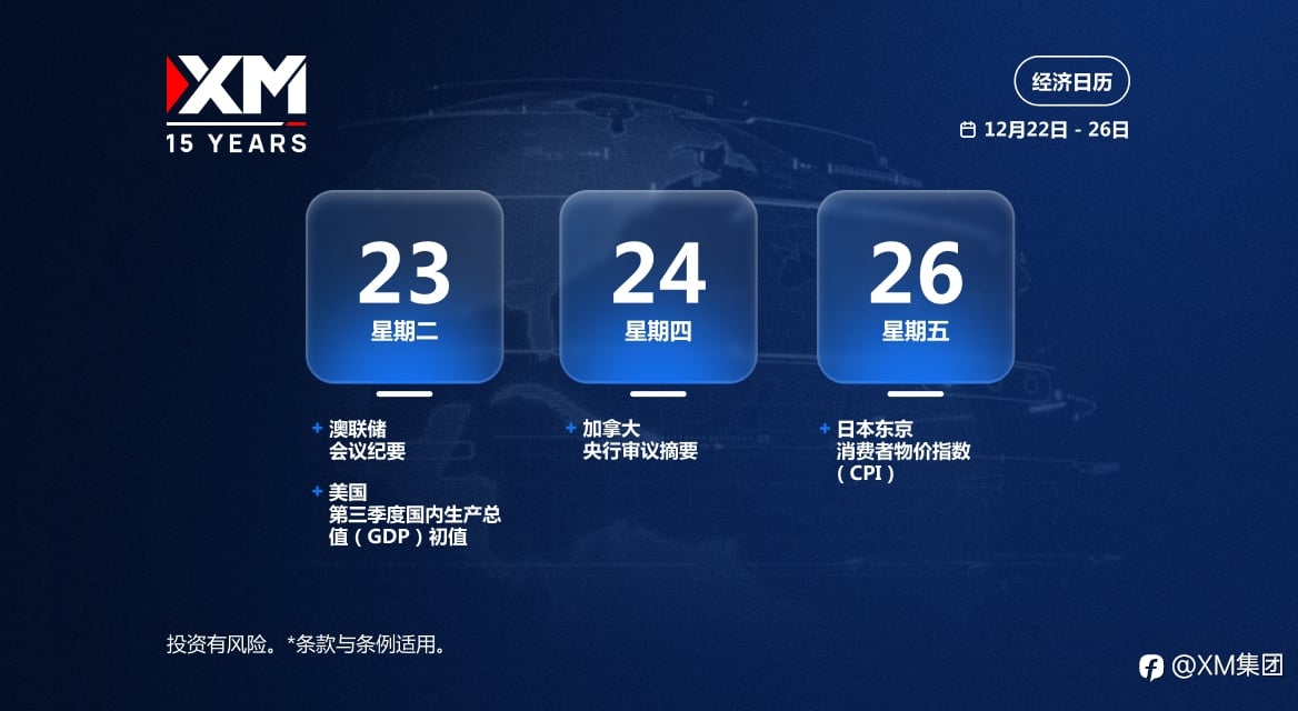 本周最值得关注的重大事件: 在市场相对平稳的时期,市场聚焦美国第三季度GDP报告、澳联储和加拿大央行的会议纪要,以及东京的关键通胀数据。 掌握市场动态。点击此处,查看完整经济日历: