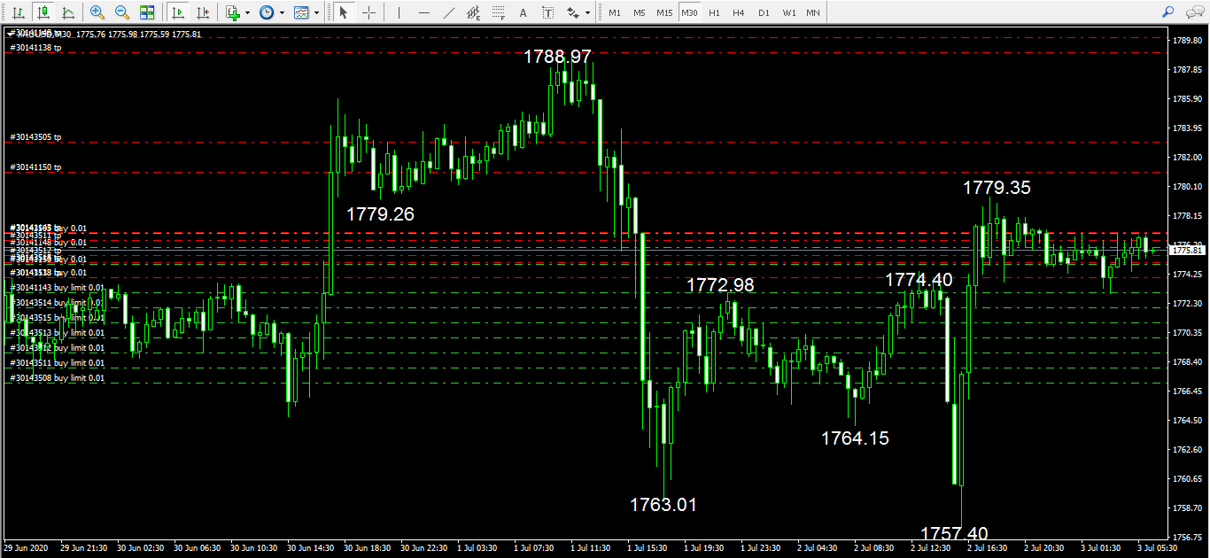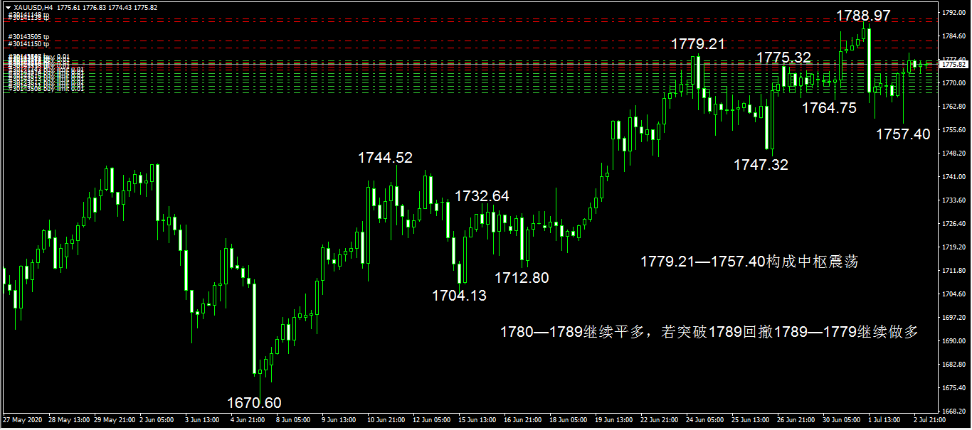 受独立日休假影响,美国劳工部选择在周四公布非农与失业率,6月数据向好再度亮瞎市场,黄金闻声大跌,再创1760新低。但是,不得不引发注意的是,这个数据只概括了上个月前半个月,而随着美国新冠肺炎二次爆发,六月后半个月的数据并没有在数据中反馈出来。因此,利空黄金变成了利空出尽,大跌之后V形反转,4小时K线拉出长下影而且穿头破脚,破低上涨后破高震荡。在形态上,1788.97—1757.40重演1779.21—1747.32的三段式下跌,再结合1747.32—1788.97的线段共同构成1779.21—1757.40中枢震荡,中枢高点1779.21与中枢辐射高点1788.97继续平多,突破中枢辐射高点1