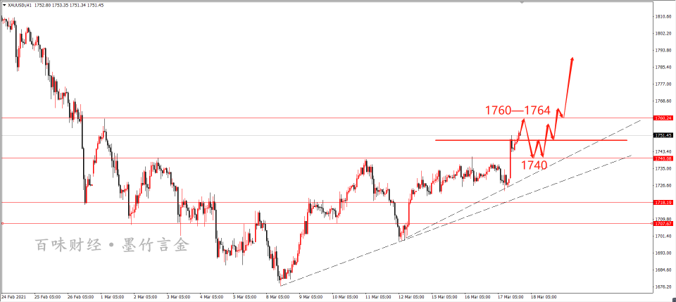 国际黄金最新行情走势分析: 黄金消息面解析:金价周三走高,现货黄金一度涨逾1%,刷新3月1日以来高点至1751.65美元/盎司,此前美联储官员继续预期基准利率至少在2023年底之前都将接近零,尽管他们上调经济展望以反映出对美国经济复苏的更乐观情绪。美元在联邦公开市场委员会政策声明公布后下跌提振了金价。美联储声明称,复苏步伐放缓之后,经济活动和就业指标最近有所上升,但受疫情影响最严重的行业仍然表现疲弱。美联储并预计今年通货膨胀率的上升将是短暂的杨杰论市表示,在美联储政策决定后,由于美元指数下跌,黄金出现迅速攀升。黄金上周初曾触及九个月低点,今年以来因美国国债收益率劲升和经济增长预期而受到打压。