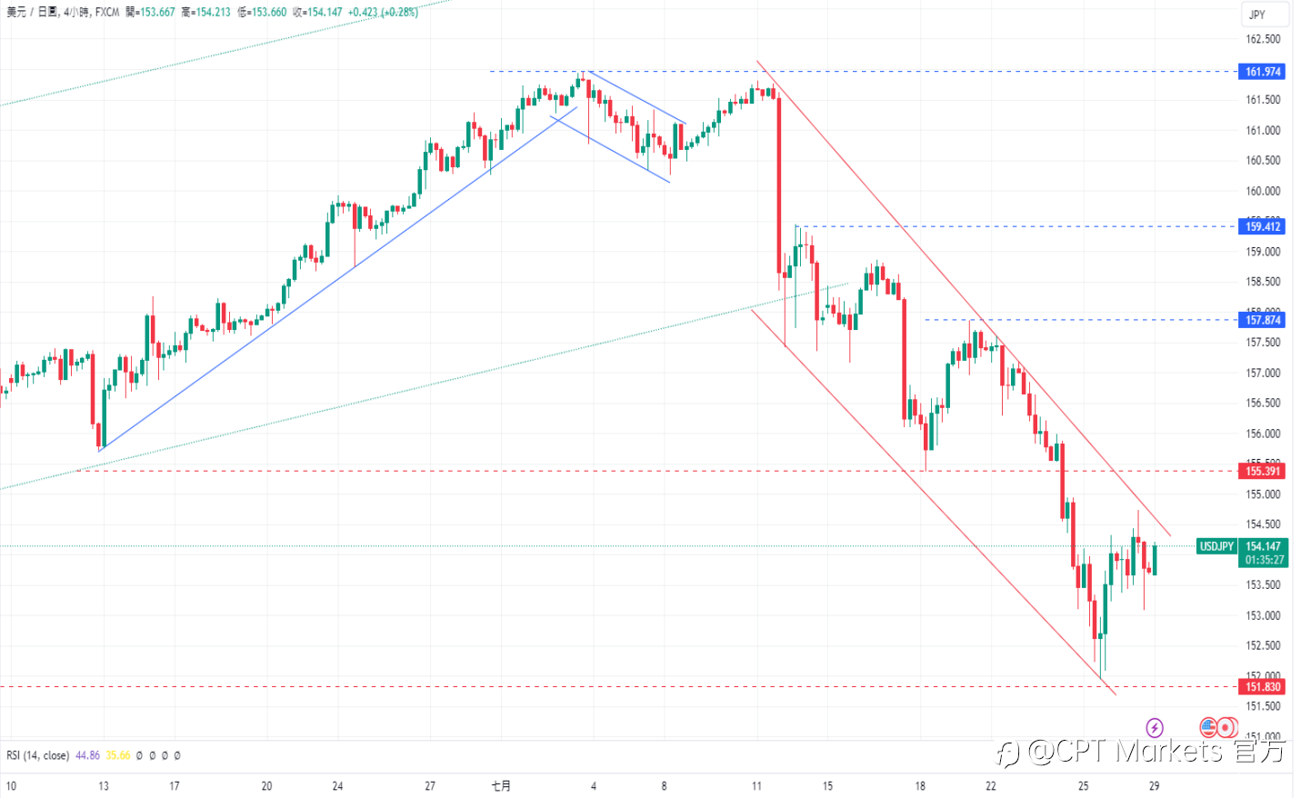 美元/日币(USDJPY): 新闻事件: 日本统计局周五公布了东京消费者物价指数(CPI)数据后,日元(JPY)走势依然不温不火。上周日本日本财务省副大臣神田正人向二十国集团(G20)通报说,外汇波动对日本经济产生了负面影响。据路透社报道,神田指出,日本经济软着陆的可能性越来越大,并强调有必要密切关注经济并采取必要措施。美国方面,周五公布的6月的核心PCE月率从预期的0.1%上升至0.2%,而年比则保持2.6%不变,高于预测的2.5%。 技术面分析: 美元/日圆继续沿着下跌趋势信道进行交易,CPT Market分析师指出下跌方面,卖方的目标依然是5月3日低点151.83。上涨方面,第一道阻力是