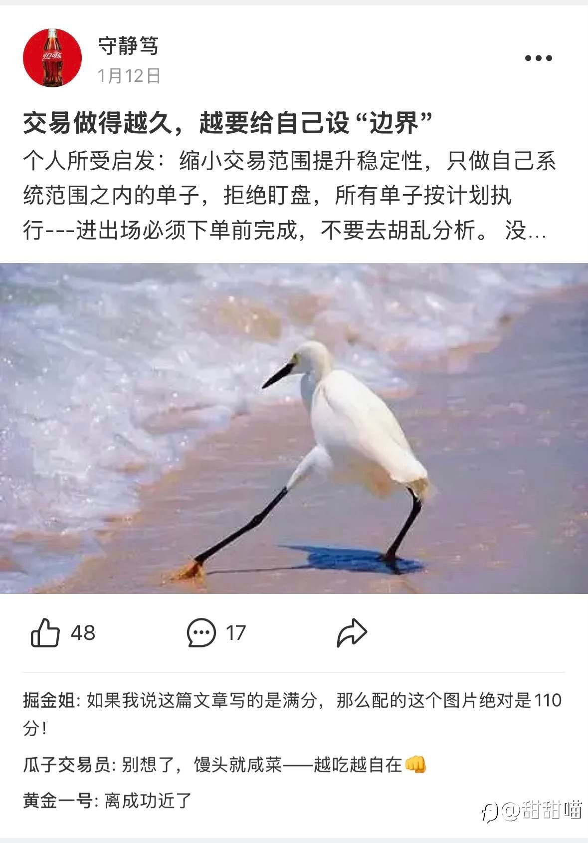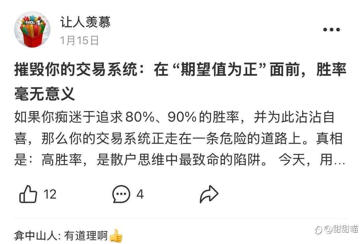 1. @守静笃 (推荐) 边界就是利润,克制才是长期盈利的核心。 2. @wq003 我们慢慢学会把期待,放在了自己的日子里。平淡安稳,也是一种难得的圆满。 但不得不说,不舍得,想一直过年! 3. @美金生产线 美金生产线团长,指挥你的兵力,加油! 4. @美元取款机 交易不是退路,是用认知和纪律换自由,三