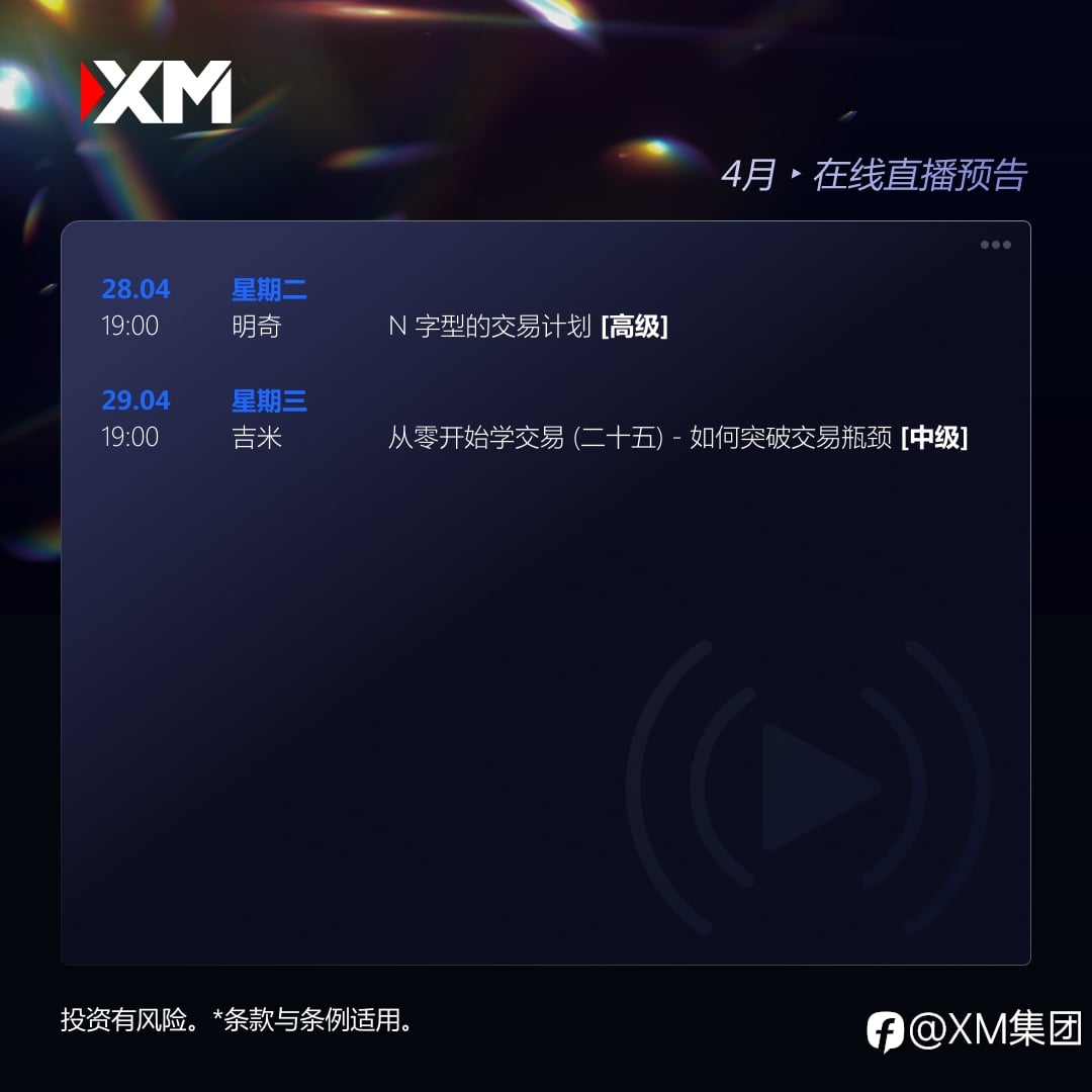 📢 美伊局势持续紧张,中东市场波动加剧。在不确定性行情中,决定交易成败的,并非信息获取的速度,而是你是否具备一套成熟且稳定的交易体系。 🔥 每周一至周五,1小时+高密度实战教学,XM中文直播课堂带你梳理行情节奏,系统掌握实用交易策略与关键出场逻辑,逐步提升交易执行力与策略稳定性! 🌟 下周重点推荐 — N字型的交易计划【高级】:以N字顶与底为核心设计交易计划,结合实战解盘,指导你科学制定入场与出场策略。 🎯 从行情研判到实战决策,全流程深入解析,助你构建更清晰、更系统化的交易思维与操作框架! 🎯 XM下周直播课程亮点 道氏理论的起源与哲学基础【中级