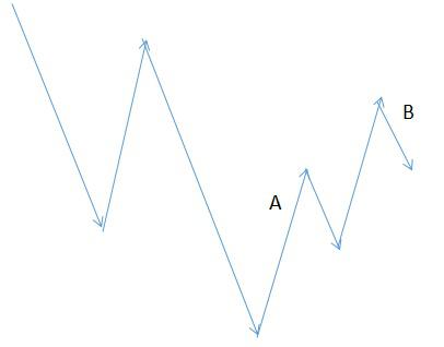 关于补仓这里要说明白的一点是,首先你要明白你补仓的目的,也就是说你要明白你接下来的操作时做短线单还是波段。目的不一样,操作的动作自然也不一样。补仓行为如下:已经形成四点下跌(或上涨)后回调到A点没破前高给出入场信号,但是A点距离前高空间相对来说比较大(波幅的二分之一到三分之二)也就是说止损比较大,这种情况下我们就会考虑减小仓位入场,比如把入场仓位减小为原来的一半。但是入场后并没有朝着下单方向走反而继续回调到B,B点并没有破前高同时再一次给出了入场信号,那这个时候我们就会
