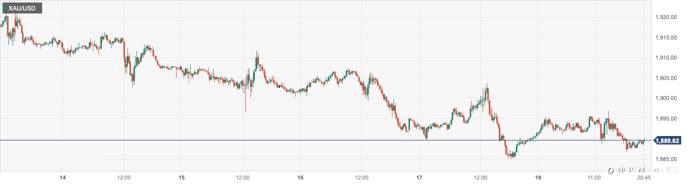 汇通财经APP讯——由于担心美联储将在更长时间内维持较高利率水平,现货黄金价格盘中跌创3月13日以来新低至1884.93美元/盎司,几乎铁定将连续第四周下跌。截至发稿,现货黄金下跌1.02%至1894.16美元/盎司。 美联储7月政策会议纪要为进一步加息敞开了大门,而且本周的数据显示美国经济具有韧性,强化了利率将在一段时间内保持高位的观点。经济学家已经调降了对今年美国经济出现衰退的预测,并愈发倾向于认为美联储可以引导经济实现软着陆。 美元指数本周料录得周线五连涨,创下15个月来的最长连涨纪录,因美国经济展现韧性,因此有理由在更长时间内维持高利率。投资者期待美联储主席鲍威尔下周在杰克森霍尔央行年