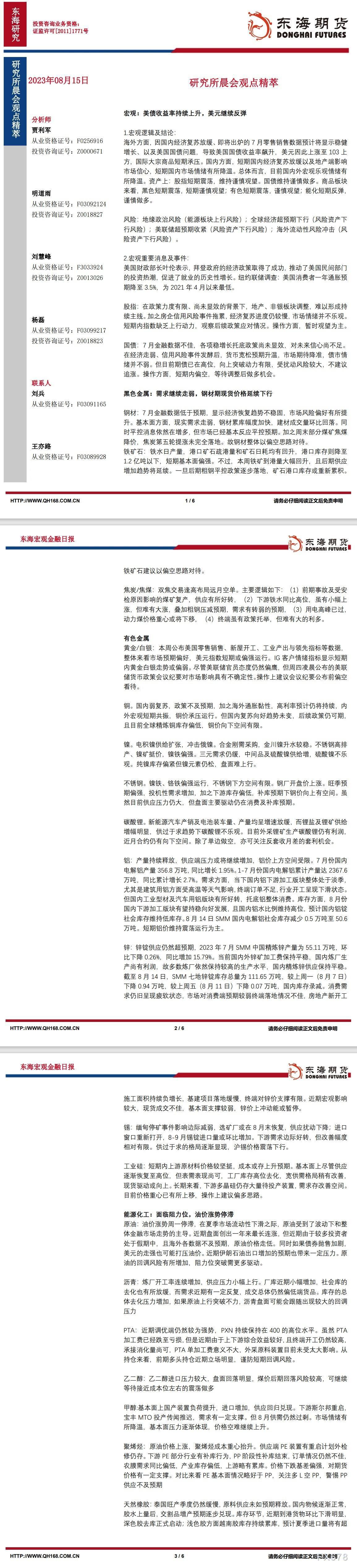 【东海期货8月15日研究所晨会观点精萃】:美债收益率持续上升,美元继续反弹