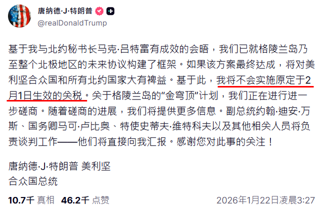 全球投资人等待已久的TACO 交易终于兑现。川普在达沃斯论坛突然转向,排除以武力处理格陵兰争议,并撤回对欧洲八国的加征关税计划,让前一日席卷市场的「抛售美国」情绪瞬间退潮。美股强势反弹、美元止跌、黄金冲高回落,但这场反转,真的就此结束了吗? 昨天发生了什么? 全球投资人等待的 TACO 交易 真的来了!「抛售美国」情绪在昨日出现明显逆转。 川普周三于达沃斯世界经济论坛发表演说,宣布已与北约领导人就格陵兰达成「未来协议框架」,并正式撤回原定自 2 月 1 日起对欧洲八国加征关税的计划,同时强调美国无意动用武力。 演说后,美股迅速反弹,抛售美
