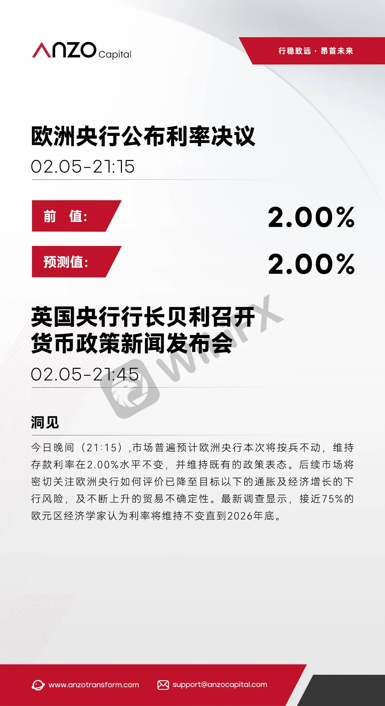 当周看点: 澳洲联储公布利率决议: 周二(2月3日) 澳洲联储公布利率决议和货币政策声明,市场预计澳洲联储将上调现金利率25个基点至3.85%的概率为73%。 欧元区公布CPI年率初值: 周三(2月4日)将公布欧元区1月CPI年率初值,市场预计1月通胀将下降至1.7%,前值为1.9%。 欧洲央行公布利率决议: 周四(2月5日)欧洲央行将公布利率决议,市场普遍预计本次欧洲央行将按兵不动,维持当前利率水平不变。 英国央行公布利率决议: 周四(2月5日)英国央行将公布利率决议,市场普遍预计本次英国央行将维持利率在3.75%水平不变。 美国公布非农就业人数: 周五(2月6日)将公布美国1月非农就业人数