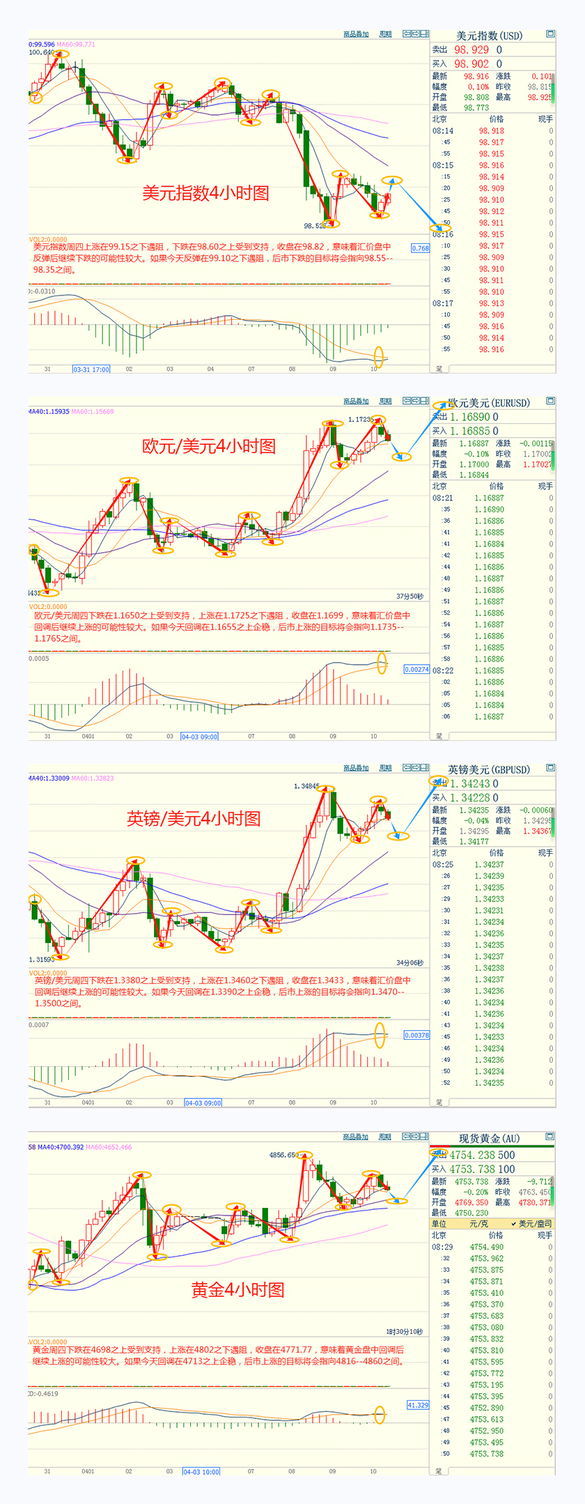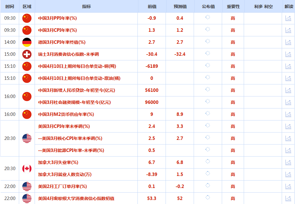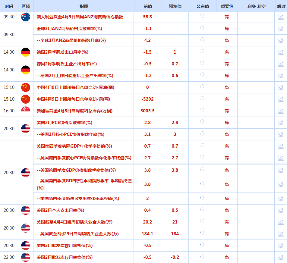 CWG Markets市场资讯2026年4月10日(周五) 汇讯摘要: 周四,在以色列寻求与黎巴嫩和谈,以及海湾地区脆弱的停战协议重燃希望之后,美元指数日内跌幅扩大,最终收跌0.2%,报98.80;基准的10年期美债收益率收报4.2810%,对美联储政策利率敏感的2年期美债收益率收报3.773%。 地缘政治风云变幻,中东停火协议的脆弱性与美国通胀数据的即将公布交织在一起,推动金价在周四(4月9日)反弹约1%。现货黄金一度触及每盎司4801美元,最终收涨1%至4765美元附近。当前黄金市场处于地缘政治风险与宏观经济数据的十字路口。周五美国3月CPI数据的公布,或将成为关键催化剂。 因内