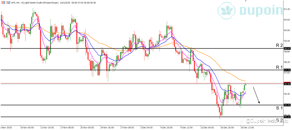 Analisa Teknikal Trend : Bearish Timeframe : H4 Harga minyak sedikit naik karena kemungkinan gangguan akibat blokade AS terhadap kapal tanker Venezuela, sementara pasar menunggu kabar tentang kemungkinan kesepakatan damai Rusia-Ukraina. Minyak mentah West Texas Intermediate (WTI) AS naik 51 sen, ata