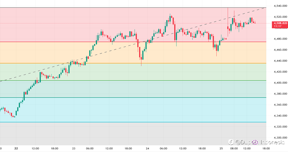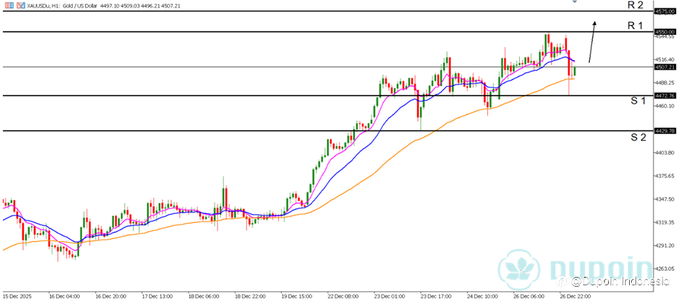 Analisa Teknikal Trend : Bullish Timeframe : H1 Emas (XAU/USD) diperdagangkan melemah pada hari Rabu setelah melonjak ke level tertinggi sepanjang masa baru di dekat $4.526 di awal hari. Volatilitas meningkat di tengah likuiditas tipis menjelang liburan Natal, mendorong aksi ambil untung ringan di l
