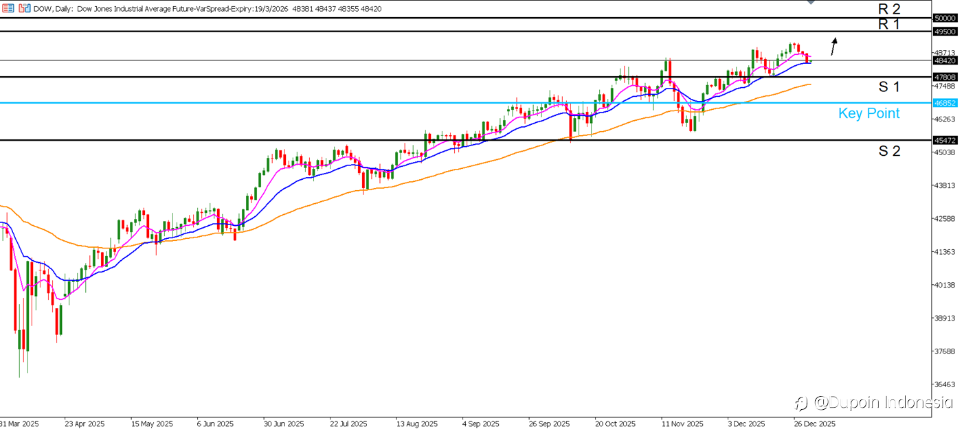 Analisa Teknikal Trend : Bullish Timeframe : Daily DJIA sempat turun sekitar -0,5% – -0,6% pada sesi terakhir 2025, mencerminkan profit-taking setelah reli panjang, sementara volume tetap rendah akibat minggu libur pendek. Di awal 2026, pasar Asia serta saham AS bergerak lebih hati-hati, dengan Dow