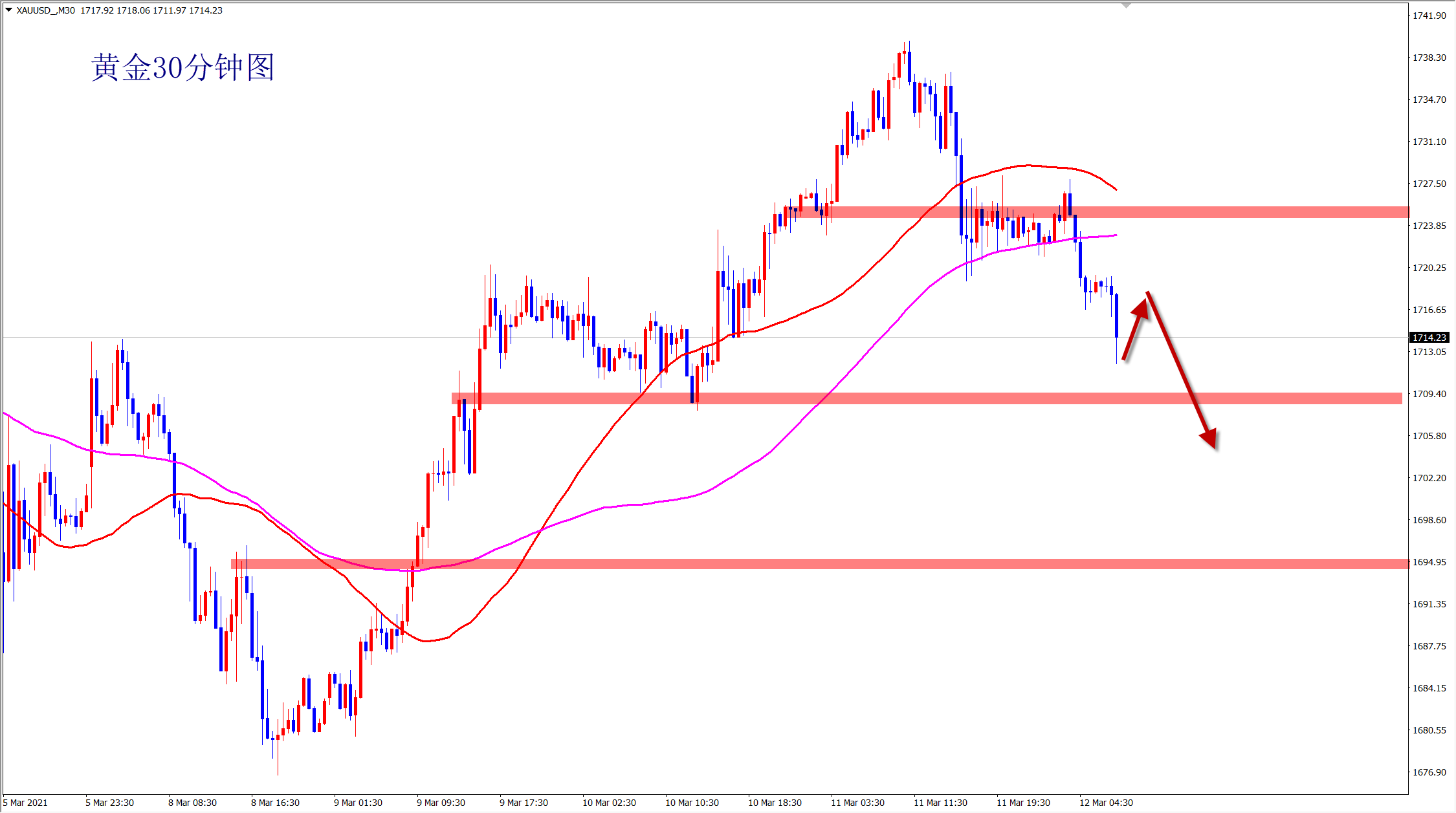 「LHCM万汇 市场盘点 」 周二(3月2日)亚洲时段,现货黄金小幅走弱,交投于1720附近。周一(3月1日)金价冲高回落,收跌0.52%至1725.04美元/盎司,因美元走强和美股大涨打击了金价,另外美债收益率继续上涨以及强劲的制造业数据也压制了金价。 不过,刺激案的进展给金市带来新的上涨动能,美联储一再淡化通胀担忧也稍微提振金价的上涨。短线金价多头反弹乏力,日内不排除跌破1717支撑位的可能,若跌破1717,将进一步看向1690-1700一带的支撑。 日内关注澳洲联储利率决议、德国1月实际零售销售及欧元区2月未季调CPI,另外美联储理事布雷纳德将就经济前景发表讲话,预计其将继续淡化通胀担忧