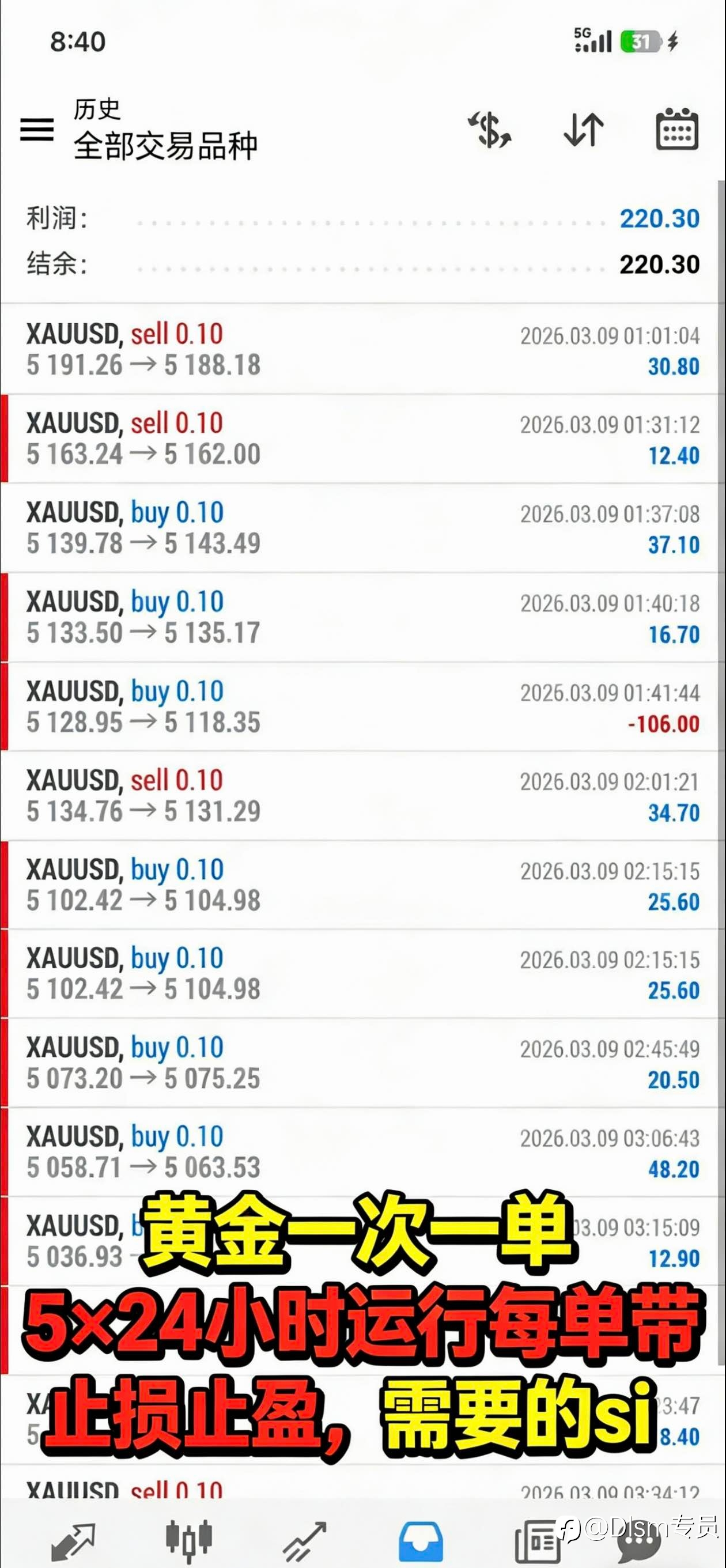 黄金一次一单 5×24小时运行每单带止损止盈,需要的si