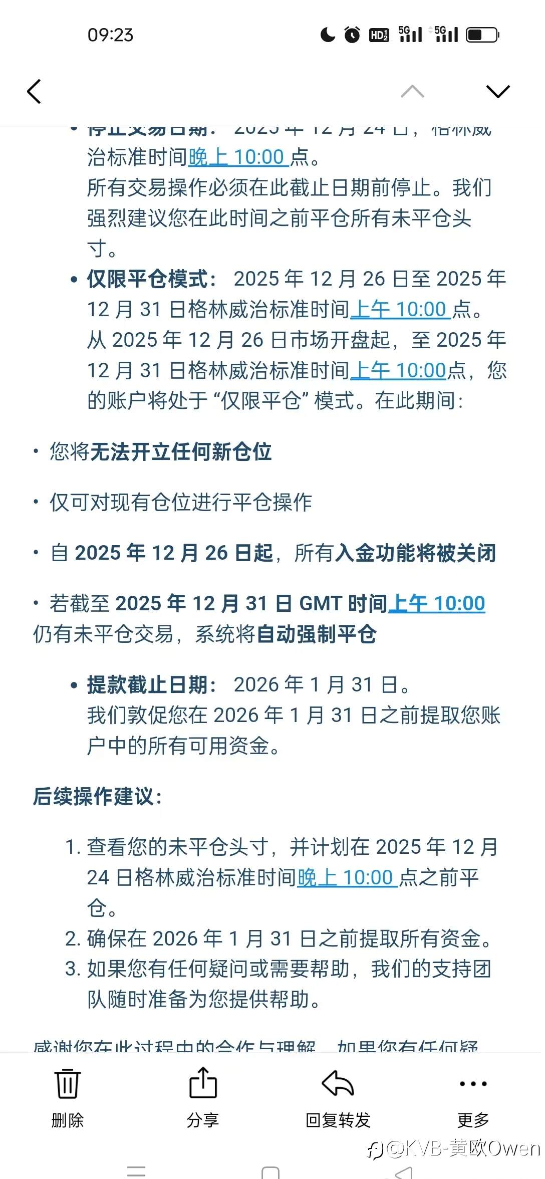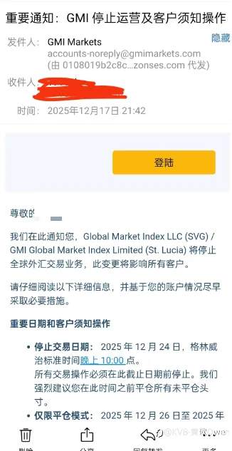 # 相信大家在昨晚九点多在各大社群汇圈里看到一则通知,那就是关于GMI平台要关闭全球市场的消息,对此,不少的投资者都表示震惊和不敢相信,成立了十几年的老牌券商GMI真的要停止运营了吗? 是的,你没看错,真的要停止运营了! # 首先,是来自于GMI平台的投资者邮件都收到了通知如图: 其次,GMI的代理和销售也在各大社社群通知:各位朋友大家晚上好,GMI已决定2025年12月31日关闭全球市场,请各位合作伙伴,通知客户出金,平台会尽快处理客户出金申请,谢谢你多年的信任。 要注意这几点: 即日起 &