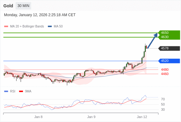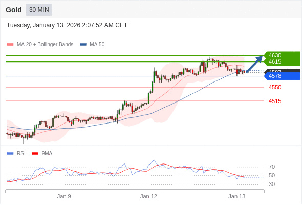 XAUUSD 交易策略 在 4578 之上,看涨,目标价位为 4615 ,然后为 4630 。 备选策略 在 4578 下,看空,目标价位定在 4550 ,然后为 4515。 技术点评 投资者应保持谨慎操作,由于这些支撑或阻力位可能引发套现。