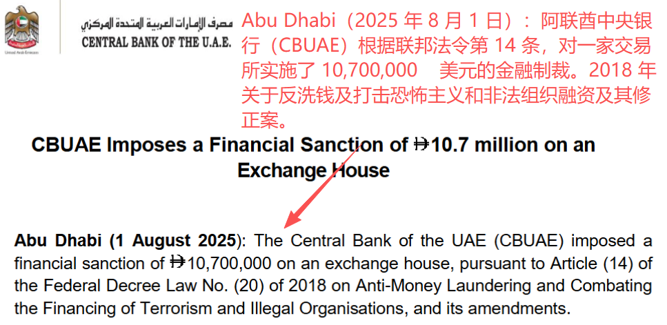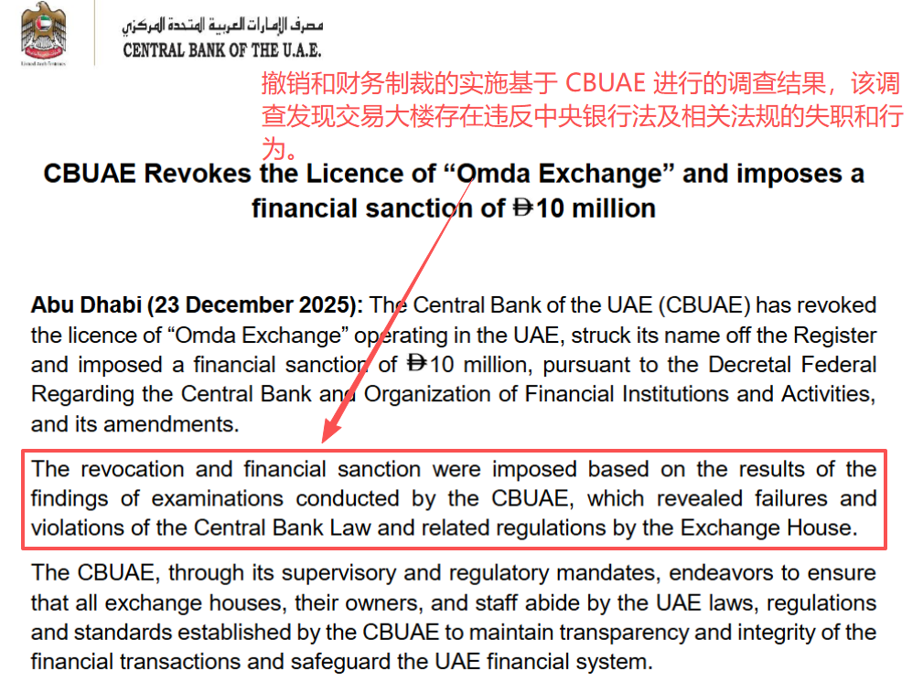 2025年12月23日,阿联酋中央银行(CBUAE)发布了一则简短却致命的公告:撤销Omda Exchange的牌照,将其从官方注册名单中除名,并处以1000万迪拉姆(约合2000万人民币)的罚款。 官方措辞冷静简洁,仅提及“发现对《央行法》及相关法规的失败与违规”,但对于行业而言,这种“通告+沉默”的组合,往往意味着问题已触及监管底线。 怎么发现的? 据信,此次雷霆行动源于一次常规的现场检查。监管人员本意是进行“年度体检”,却在Omda Exchange内部发现了系统性问题。虽然未公开具体细节,但结合阿联酋近年打击Xi钱与恐怖主义融资的凌厉态度,Omda极可能倒在以下几件事上:
