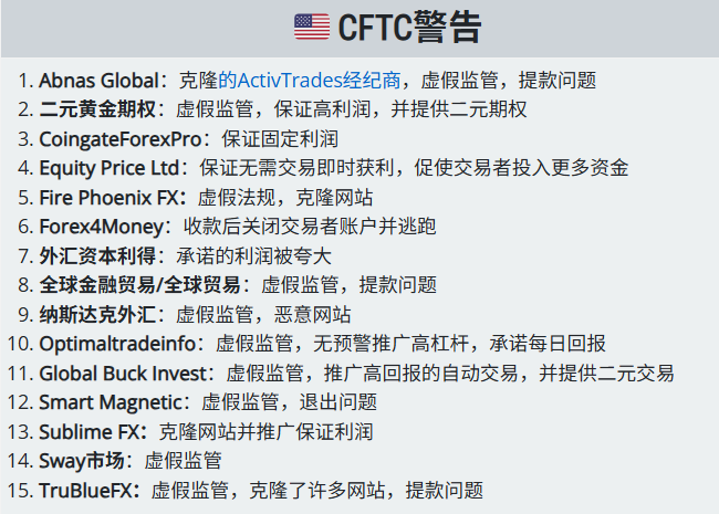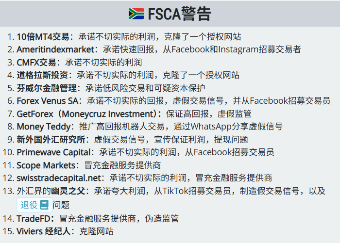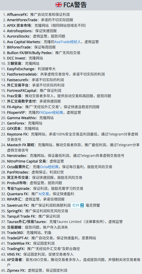 监管不断收紧、网站频频被封,却依然拦不住那些黑平台。它们最拿手的两招无非是:换个域名、改个包装,然后继续用“稳赚不赔”“AI自动交易”“导师带单”这些老套路来收割交易者。 我们已更新2025版警示名单。下面这些名字,都是今年被多家金融监管机构正式列入警示名单的对象——别拿你的本金去冒险,它们毫无底线可言。 三大监管机构联手点名 2025年英国FCA警告的可疑平台包括(部分特征:克隆站、伪监管、保证收益、AI噱头、提现问题): 美国CFTC警告名单里常见问题更直接:伪监管、二元期权包装、收款后关号跑路、提现困难。 南非FSCA警示名单里,社媒拉人头、假信号群、冒充持牌机构