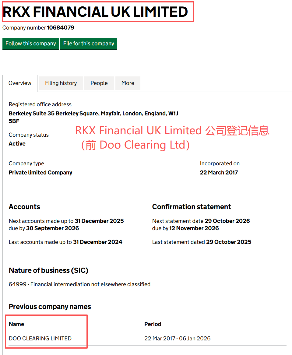 外汇圈头部玩家之一的德璞集团又有了新动作。这次,旗下的英国公司Doo Clearing Ltd在英国Companies House正式更名为RKX Financial UK Ltd。背后究竟有什么深意? 规避监管压力还是玩“高阶”服务? 而此次,Doo Clearing Ltd更名为RKX Financial UK Ltd,从英国的FCA持牌实体到南非FSCA的新品牌启用,RKX显然是专注于服务机构客户和高端玩家,尤其是在加密货币交易等领域,提供最高1:1000杠杆的“顶配”服务。 全球布局 德璞的全球版图正朝着两个方向发展,亚洲市场和欧洲市场的战略差异化越来越明显。